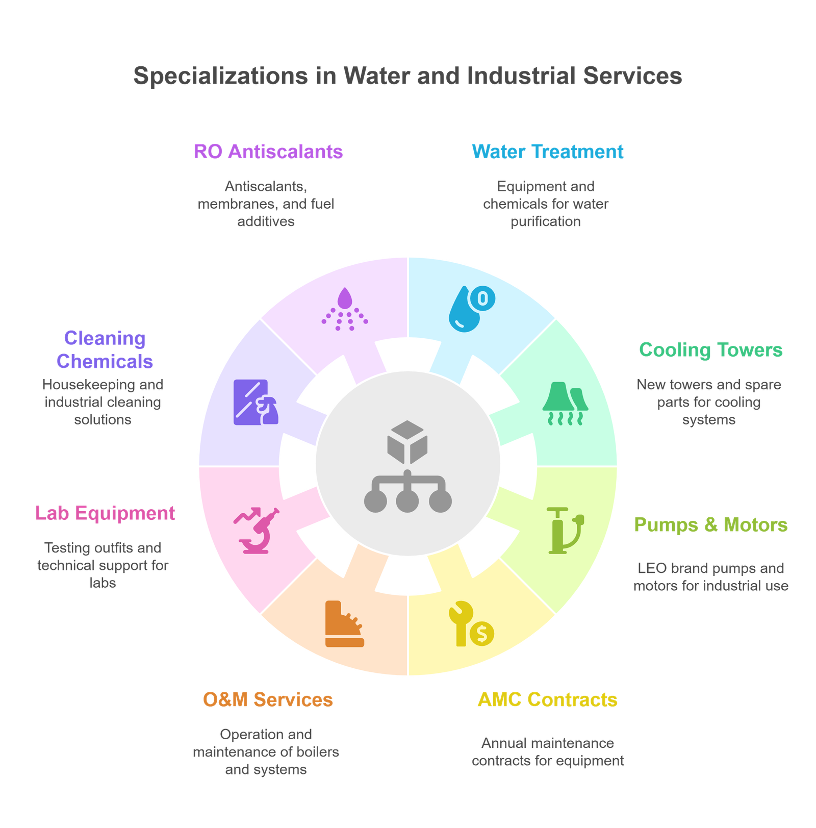 Extensive portfolio including RO chemicals, cooling towers, pumps, motors, and cleaning chemicals.